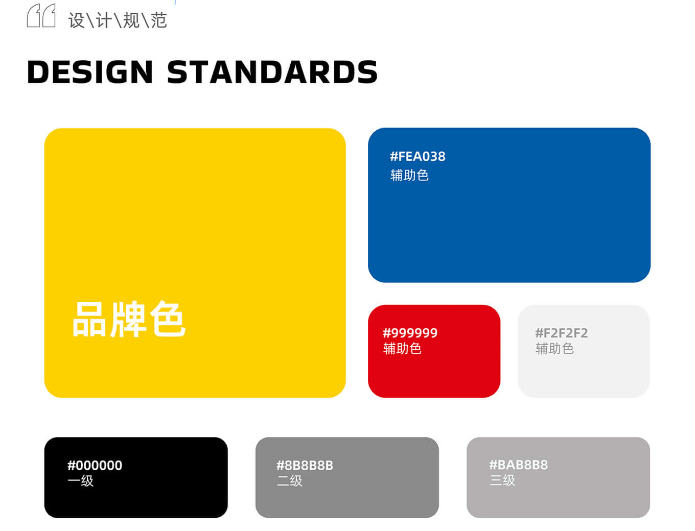 从设计规范上,我们看到,软件的主色(品牌色)为黄色(RGB编码:fdd100),辅色为蓝色(#FEA038)和红色(#999999),过渡色为灰色(#F2F2F2)和黑色(#000000)。从风格定位上来说,结合大运会的运动场景,把主题梳理成三个关键词:运动、高效、快捷,很好地诠释了速度和节奏感,以及城市APP给大家带来的便捷。