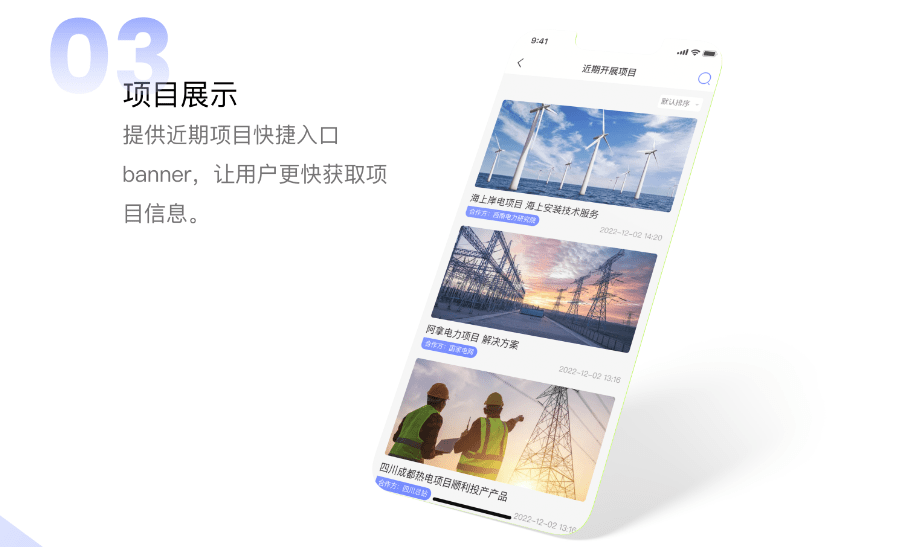 下面我们来梳理一下这个项目的重点,方案与技术服务列表。这个列表占了整个APP界面较高的比重,把它放在这里的意义是什么呢?我们可以把它看做是一个成果的展示。展示全国各地优秀的电力建设技术服务方案。可以作为一个表彰,复盘的窗口,也是行业人士学习的窗口。当我们看到自己的项目出现在APP痴女,进行重点介绍的时候,我们的心情一定是很愉快的,也会激励我们,激烈行业人士,更好地奋斗发展。