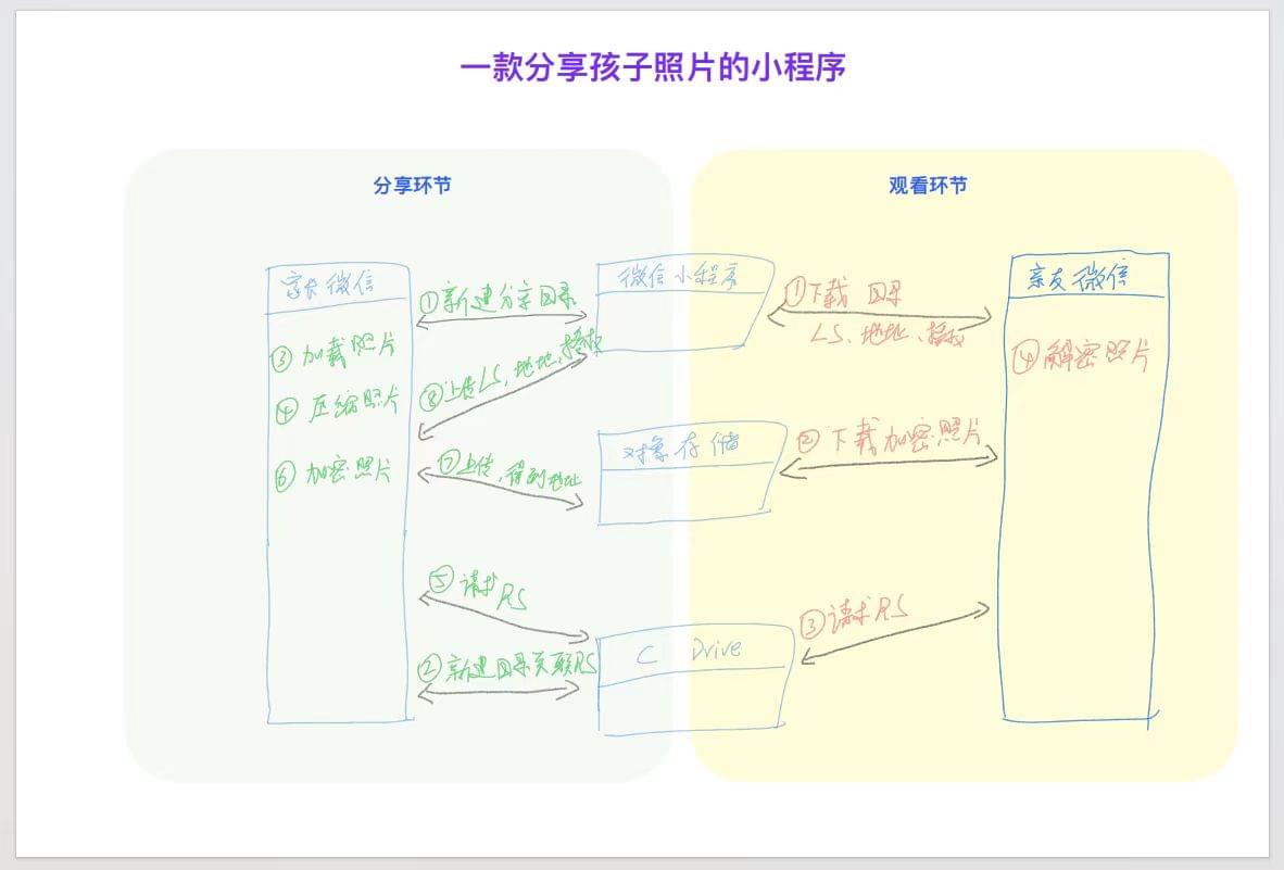 作为分享照片的小程序,逻辑很简单:上传-压缩-加密-分享-查看。另外就是我们的照片放在哪个位置,出现了OSS对象存储之后,可以很快速安全地讲照片、视频放到服务器上,性价比很高。既然有了这么好的技术出现,那么制作照片、视频之类的小程序,就很方便,而且成本也比较便宜。