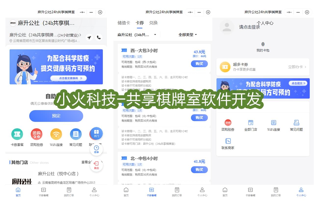 下面是痴女 的一套24小时共享棋牌室小程序案例。软件对接硬件之后,可以实现开门、离店、订单开始电源自动开启等功能。同时用户在软件上可以选择卡券套餐、续单、团购验券、WIFI连接、联系商家。