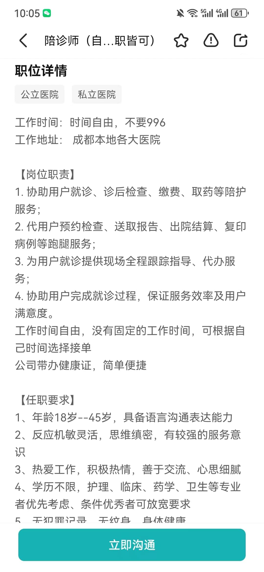 我特地在boss上搜索了陪诊师职业。发现了蛮多的陪诊师招聘信息,或全职或兼职。其中的一家招聘信息是这样写的:
