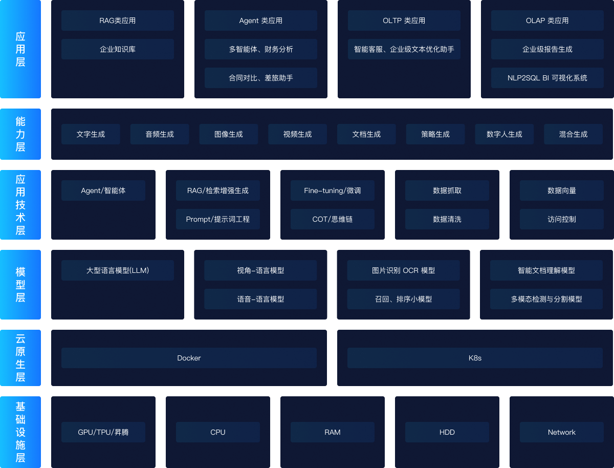 支持LLM运行时LangChain、Ollama;开发框架LangChain、Llamalndex、AutoGen(微软);业务编排Dify、RAGFlow等开发框架与工具,更高效地构建、训练和部署大模型应用。