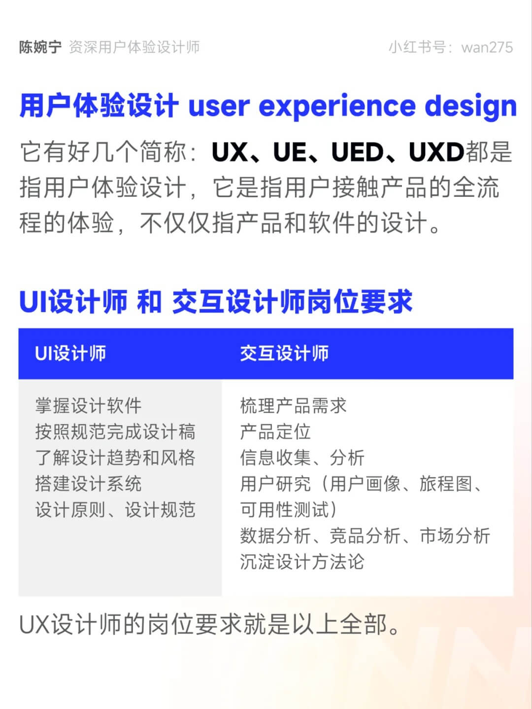 它有好几个简称:UX、UE、UED、UXD都是指用户体验设计,它是指用户接触产品的全流程的体验,不仅仅指产品和软件的设计。