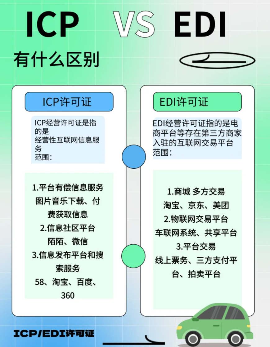 ICP适用于收费的网站,而EDI适用于有第三方商家入驻的平台。二者虽然都是《增值电信业务经营许可证》的业务范围,但因其性质和方向的不同而有所区分。