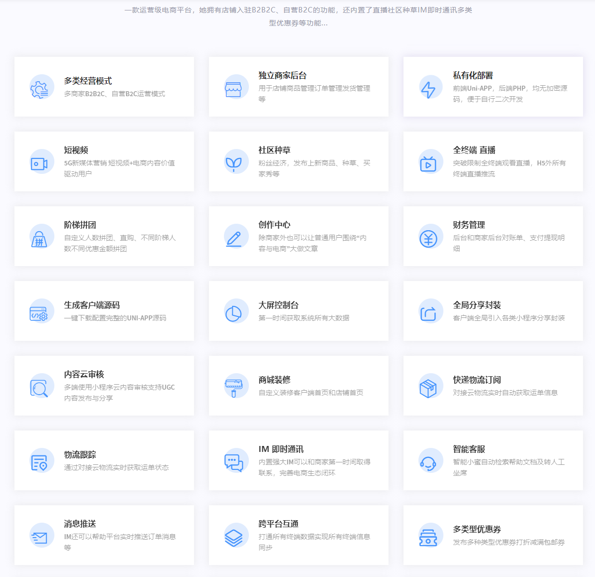 从上面丰富的功能,我们可以看到,我们的这套种草商城系统是一款集短视频、社区种草、直播、拼团等多种功能于一体的电商解决方案,有着丰富完善的功能,对于打造场景购物体验,起到了很好的建设作用。如何让自己的商城在众多同行中脱瘾而出,软件的选择就很重要。相信我们这套差异化的电商系统,能够给平台和商家提供很强的软件竞争力。