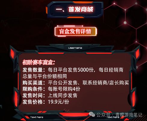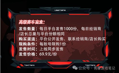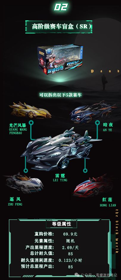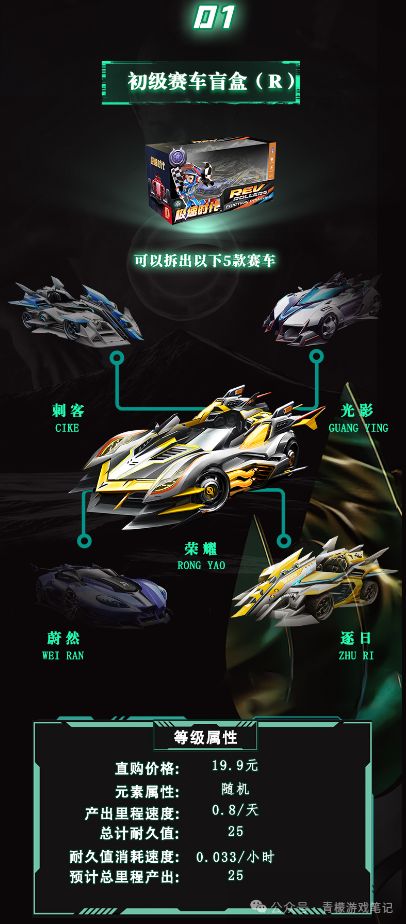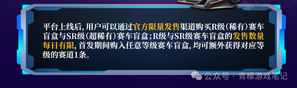 核心玩法介绍:游戏公测上线后可以购买盲盒,盲盒分19.9和69.9两个级别,69.9的盲盒保底出SR及以上级别赛车。