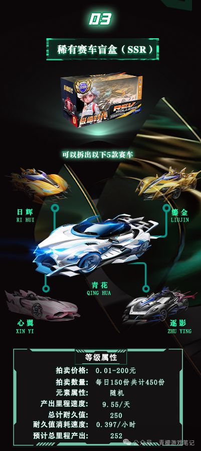 赛车及赛道介绍:极速时代平台赛车分为4个等级:R SR SSR UR ,每个等级产出的里程不一样,越高级的产出就越多。