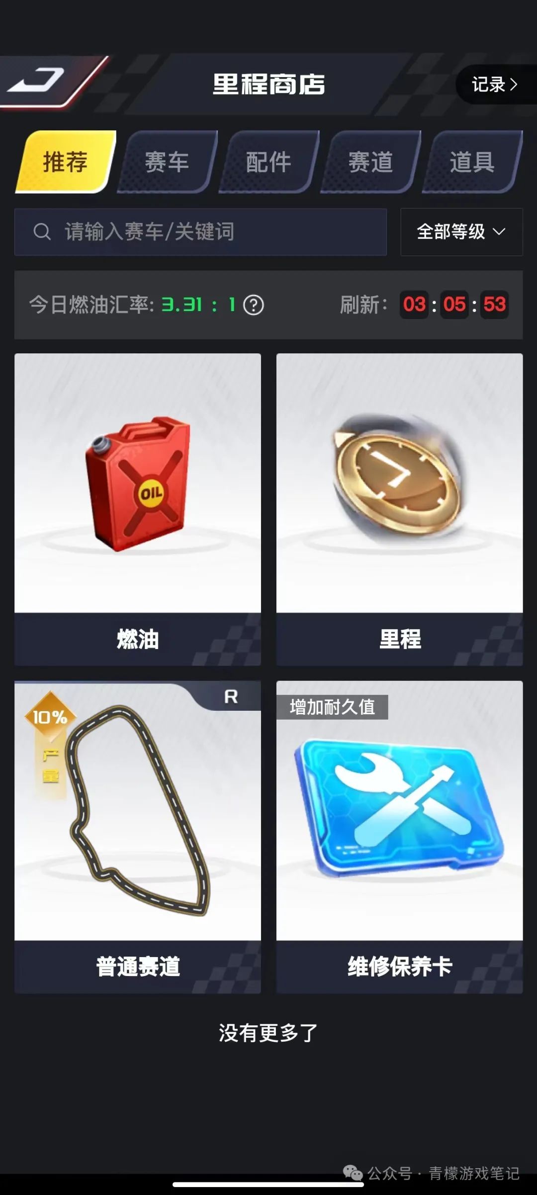 里程还可以通过里程商店兑换配件、高等级赛道、保养卡、赛车盲盒等奖励,赛车产出里程会消耗赛车耐久值,需要在里程购买耐久值。