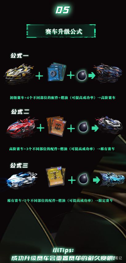 赛车升级:赛车可以通过改装提升等级,合成公式可以看图,