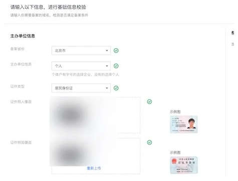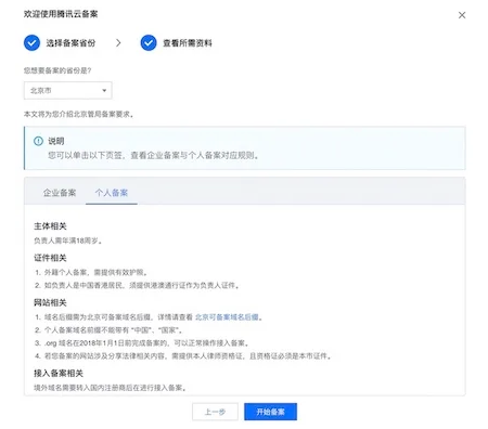 点击开始备案,填入之前准备好的基础信息(这个页面很长,按照提示上传你的个人信息即可)