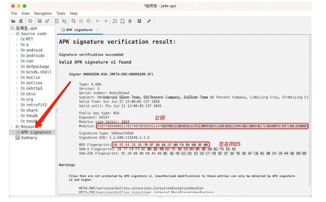 使用 jadx 打开 APK 即可查看 APK 的公钥和签名 MD5 值,如下图所示,jadx 的安装也比较简单,如果安装过程中遇到问题可以私信我。