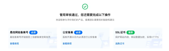 到这里 APP 备案过程全部结束了,因为我的个人域名之前备案过,所有流程走的比较快的,大概 3 天就完成了审核,如果是新增域名的话,那么时间可能会长一点,当你备案成功后,还有几件重要的事,需要在 30 天以内完成,否则会取消你的备案。