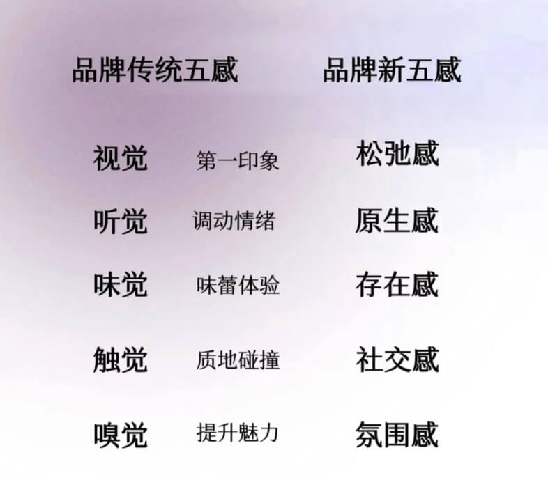 品牌五感理论最早由美国品牌营销大师马丁·林斯特龙在《Brand Sense》一书中提出。该理论主张通过具象的色彩、声音、气息、味道、质感来刺激消费者的感官,进而激发购买欲望,甚至影响消费者的潜意识购买行为。