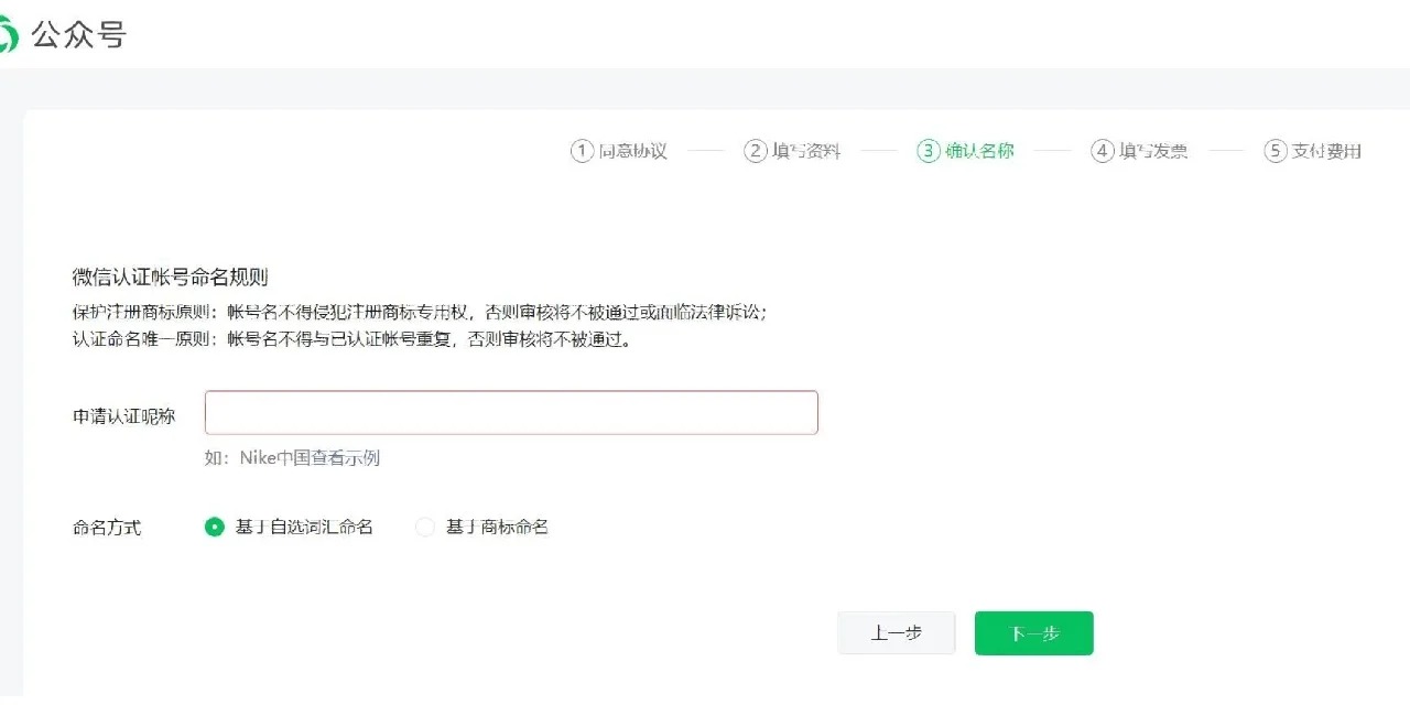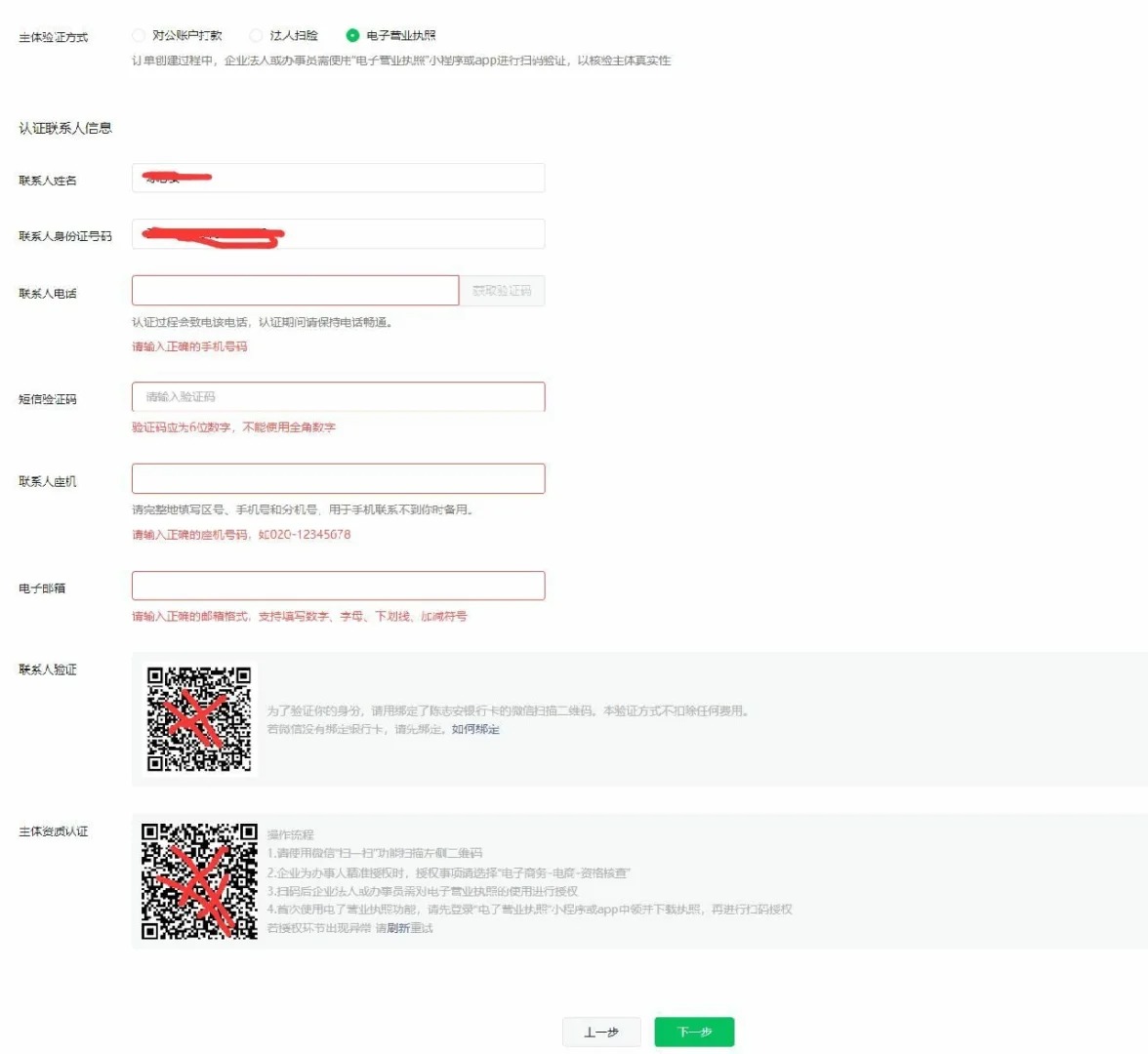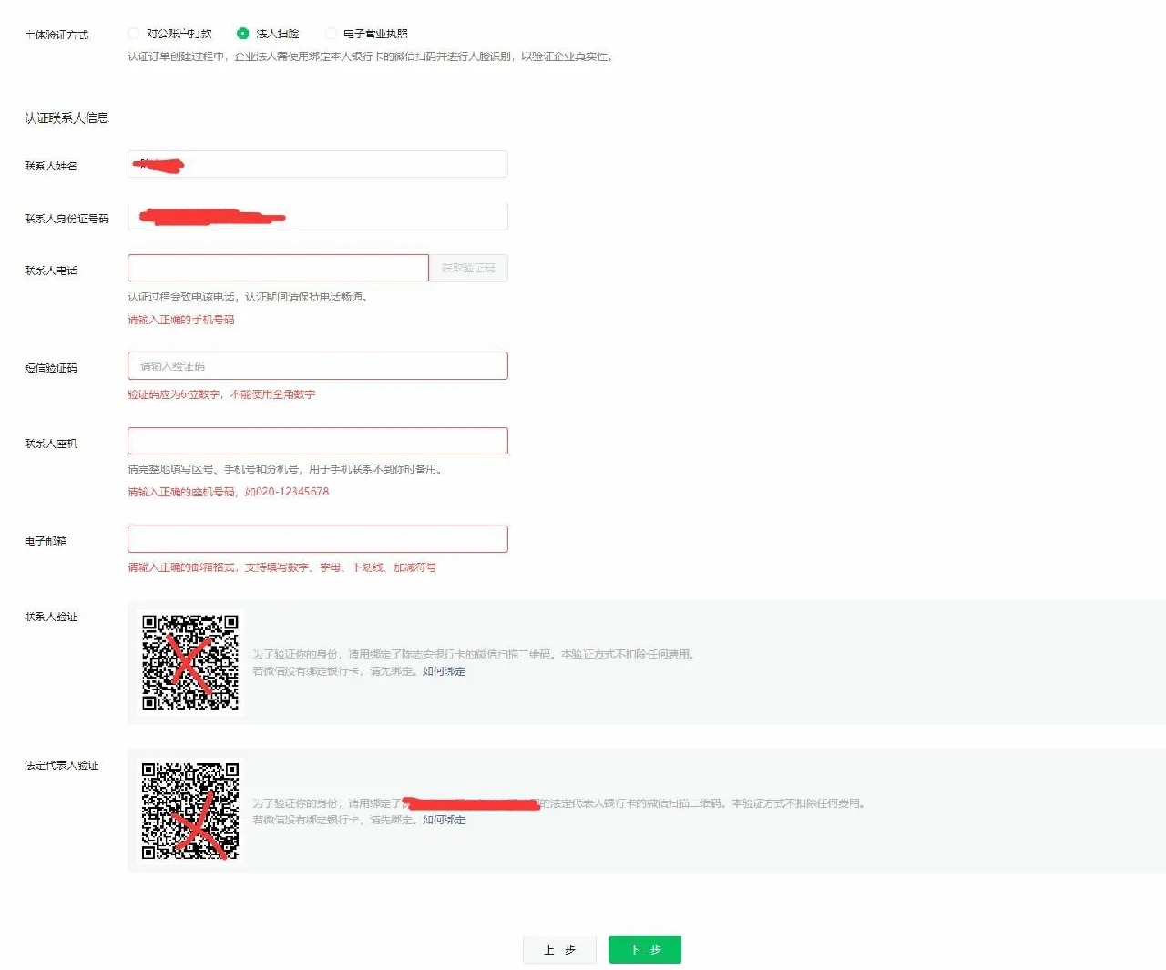 认证联系人信息: 联系人姓名、联系忍身份证号码、联系人电话、短信验证码、联系人座机(可以填备用手机号)、电子邮箱、以及主体验证方式部分信息三、确认名称