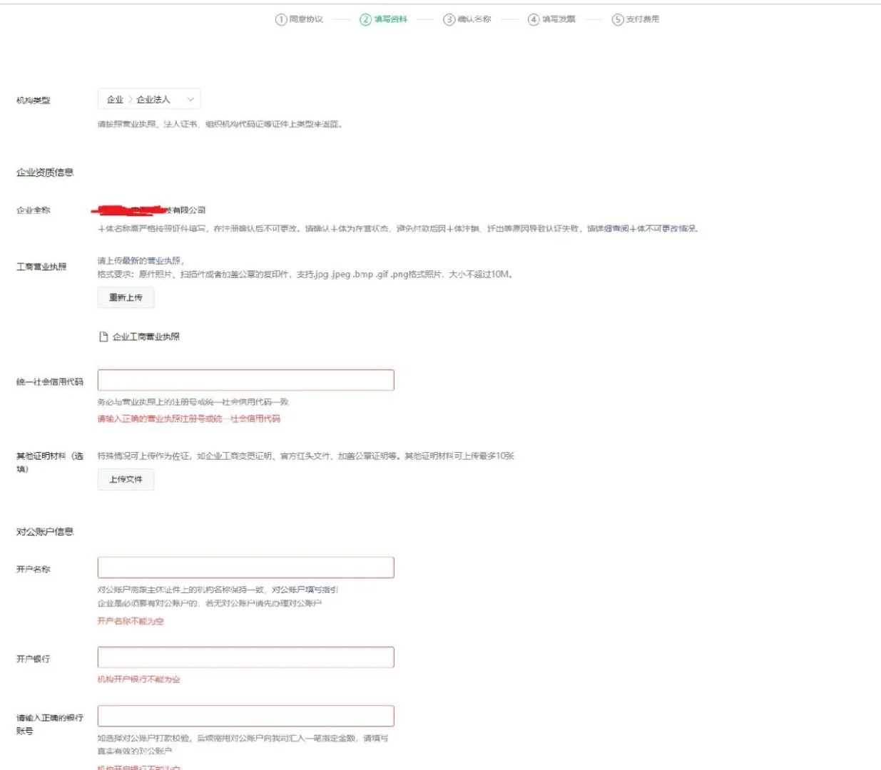 开户名称、开户银行、开户银行账号(如果主体验证方式为“对公账户打款”,这这三项必须是真实,后续重新认证可以修改,但重新认证的认证费300要交)