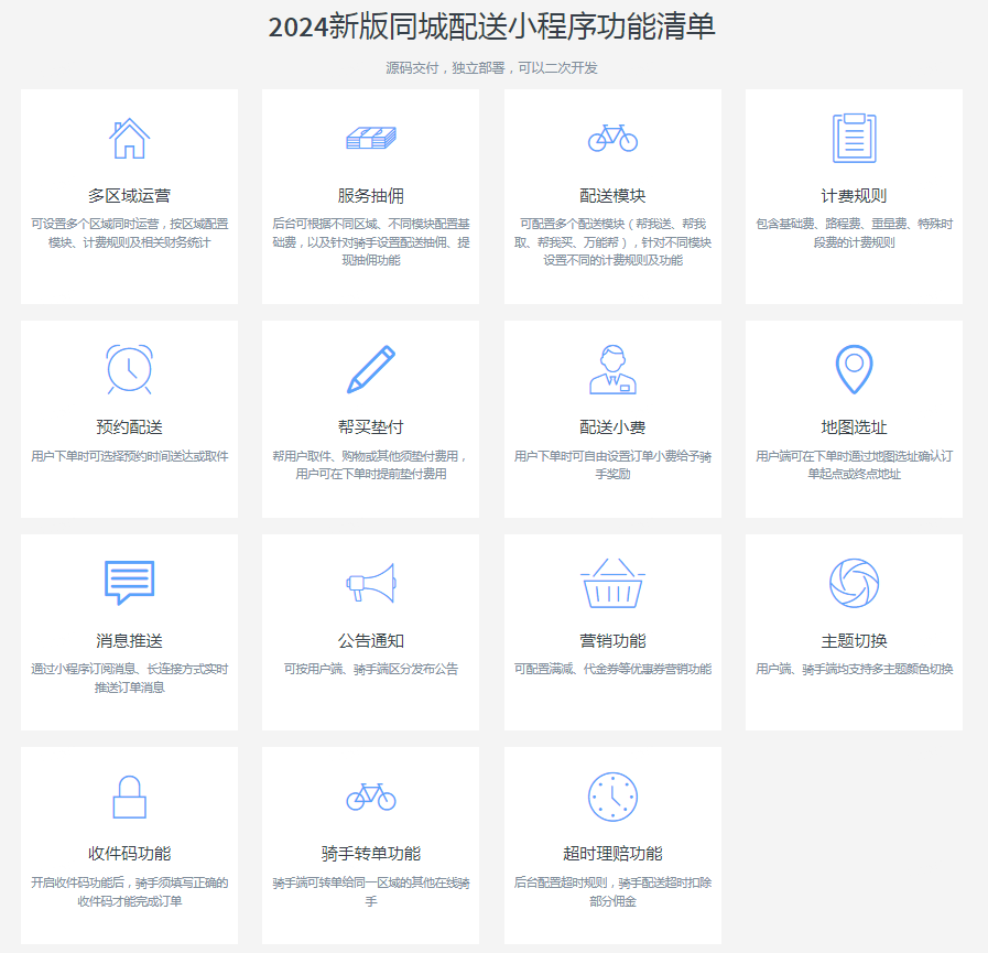 好了,几天这款“2024新版同城配送小程序”我们就介绍到这里。这款小程序是源码交付,私有化部署,可以在这款小程序上进行功能减少或者增加,支持按需定制的二次开发。不管是用户端、骑手端,还是管理端,我们都要求功能简洁明了,用户体验要做好。我们分析了很多web应用的字体大小,行间距,左右边距等。找到了目前用户体验很好的一套代码逻辑,并呈现出了这款“2024新版同城配送小程序”,我们相信它会是是面上表现突出的小程序之一。