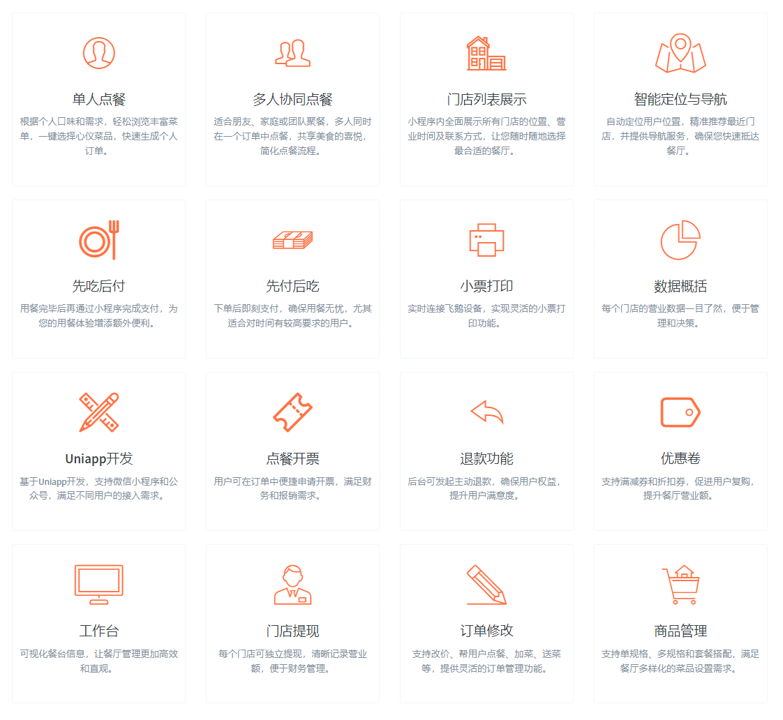 我们深知餐厅管理的重要性,因此还特别提供了工作台功能,通过可视化餐台信息,让餐厅管理更加高效和直观。同时,我们还支持点餐开票,用户可以在订单中便捷申请开票,满足财务和报销需求。每个门店可独立提现,清晰记录营业额,便于财务管理。实时连接飞鹅设备,实现灵活的小票打印功能。此外,我们还提供了退款功能和订单修改功能,后台可以发起主动退款,确保用户权益,支持改价、帮用户点餐、加菜、送菜等,提供灵活的订单管理功能。