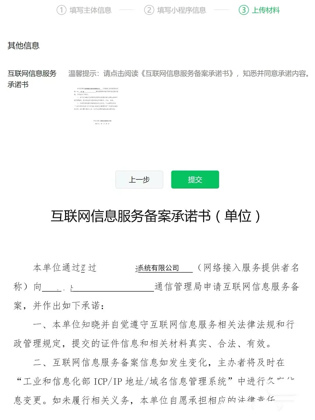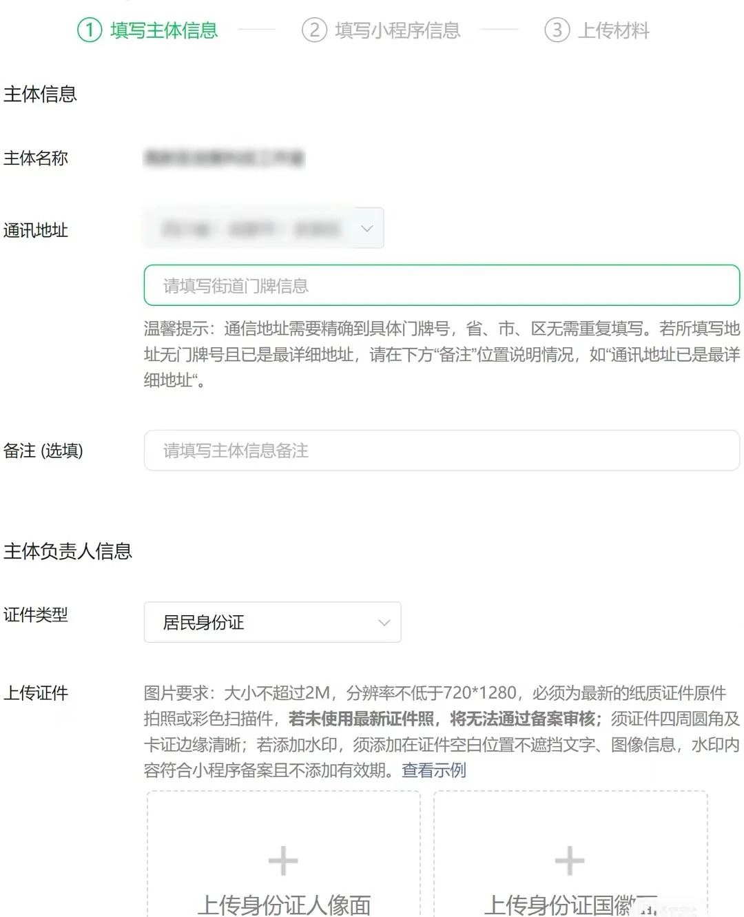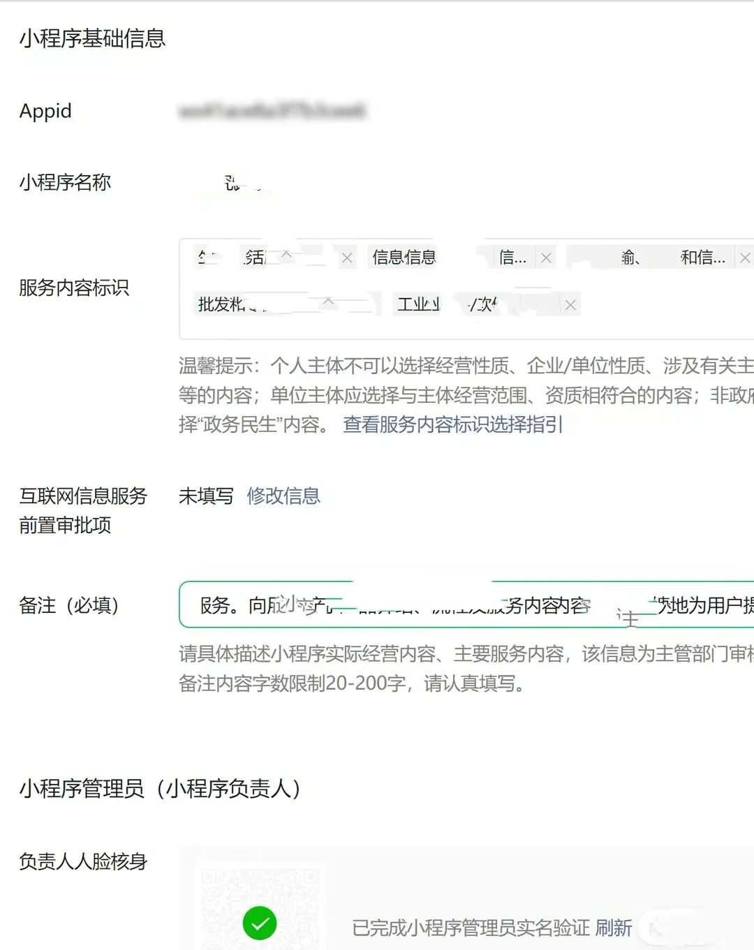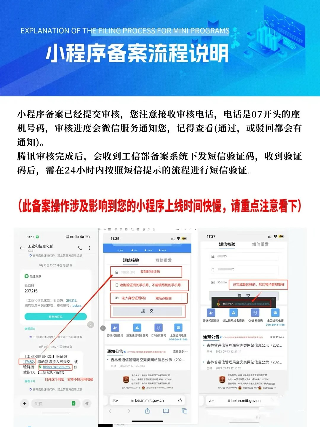 小程序备案流程:小程序管理员扫码验证→上传营业执照进行主体验证→填写主体信息(通讯地址、主体负责人信息、手机号、应急手机号、邮箱)→填写小程序信息(选择最多五项的服务内容标识、选择互联网信息服务前置审批:特殊行业需上传相关资质,不是特殊行业选择“以上都不涉及”)→填写备注(文字描述小程序的使用场景)→填写小程序管理员信息(上传身份证、填写手机号、邮箱及人脸验证→阅读《互联网信息服务备案承诺书》→提交