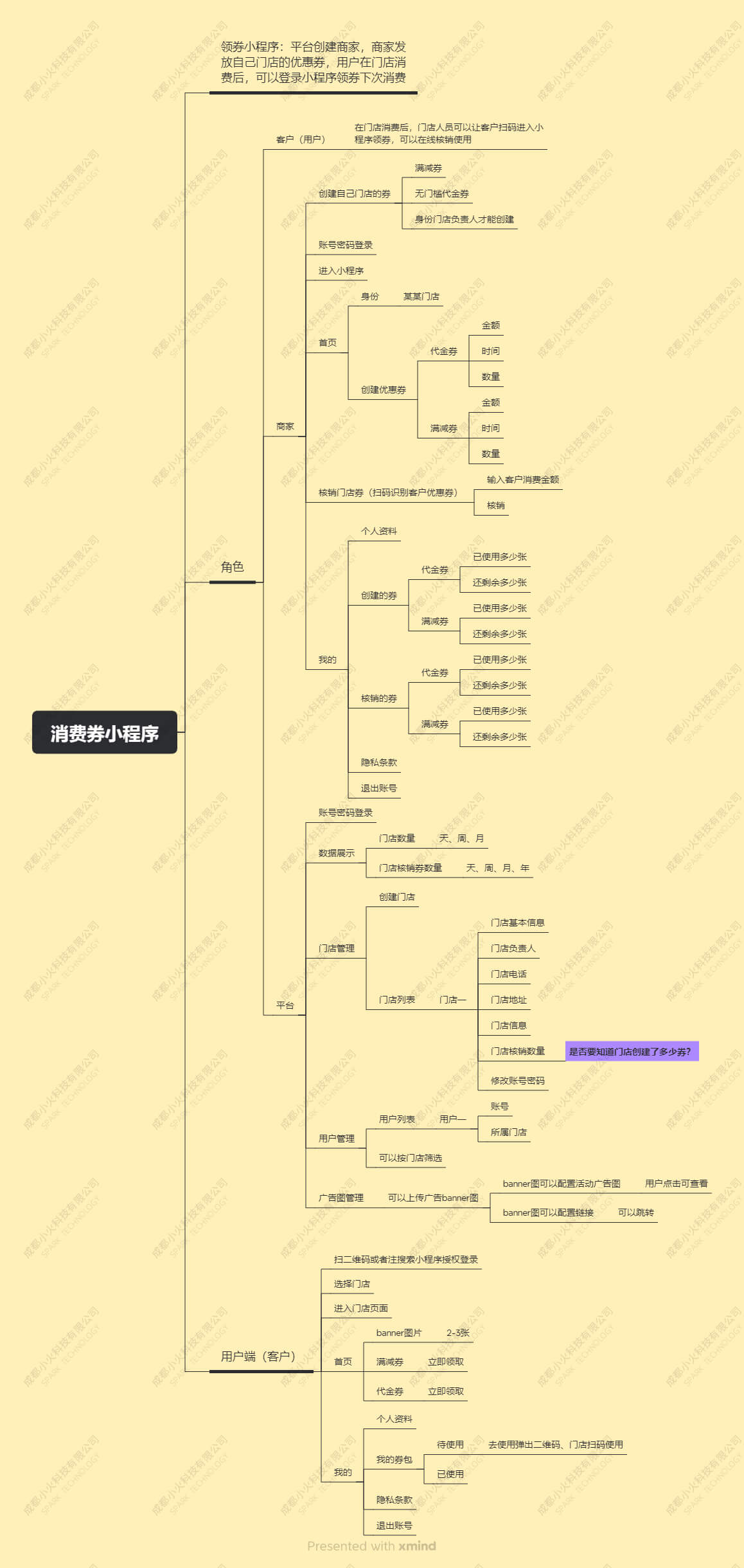 下面是一套的结构梳理图,从图上我们可以看出,这是一套实体门店的消费券小程序,用户到店之后,扫码可以领取优惠券,现场核销或者下次核销进行消费。优惠券的使用简单明了,简单的步骤,就能让用户享受到实在的优惠。所以针对优惠券的小程序是很受用户喜欢的,加上结合微信的实用背景,非常方便。