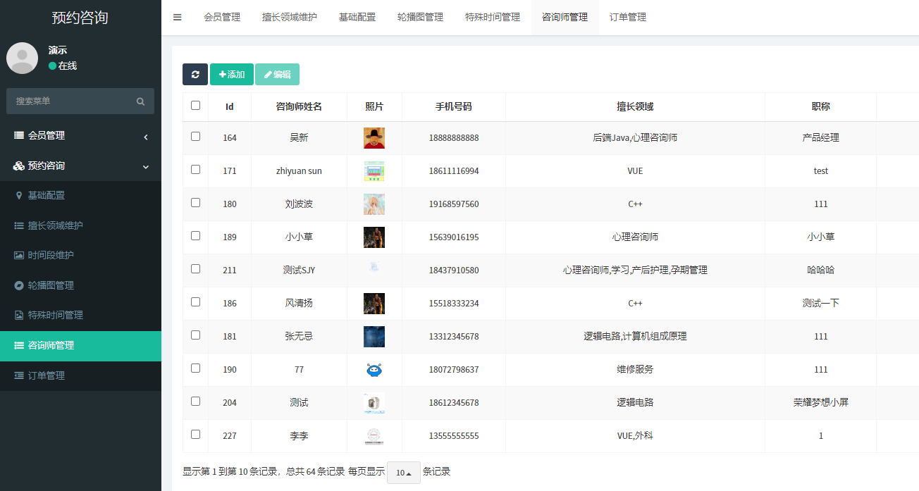 5. 咨询师管理:后台支持上传和管理咨询师信息,包括专业资质、服务时间、费用等,满足日常运营需求。