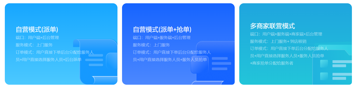 订单模式:派单模式,支持用户直接下单、后台分配服务人员,也可由用户直接选择服务人员。
