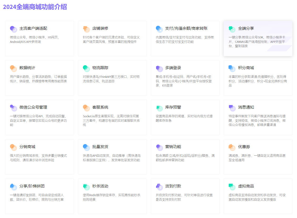 这套系统内置了微信和支付宝的支付与出账功能,并支持微信生态下的支付宝支付。同时,全端分享功能也让用户能够一键分享商品信息,包括微信公众号SDK、卡片、CANVAS客户端海报绘制、APP开放平台和复制链接等。