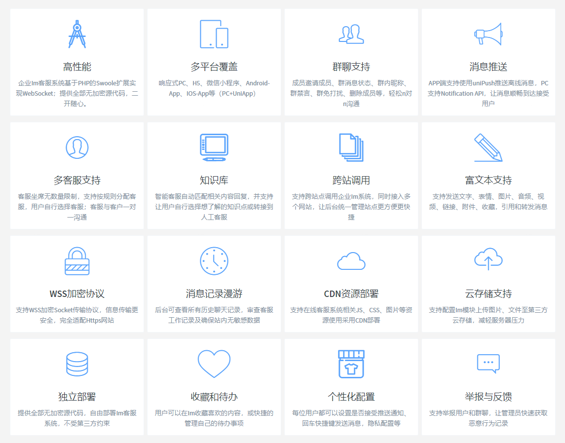 1. 性能高:基于PHP的Swoole扩展实现WebSocket,确保高速稳定的通讯性能。同时,我们提供全部无加密服务端源码和前端源代码,独立部署,不受限制。