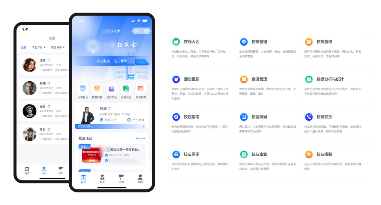 活动组织功能使得系统能够高效地组织和管理各种校友活动,无论是线上聚会还是线下联谊、公益活动,都能通过系统进行便捷的管理和推广。校园风光模块则以图片的形式生动展现了学校的发展历程和专业建设成果,增强了校友对母校的归属感和自豪感。我们人生中,校园生活是很美好的回忆,让校园的美好一直延续下去,会是校友们都想看到的。