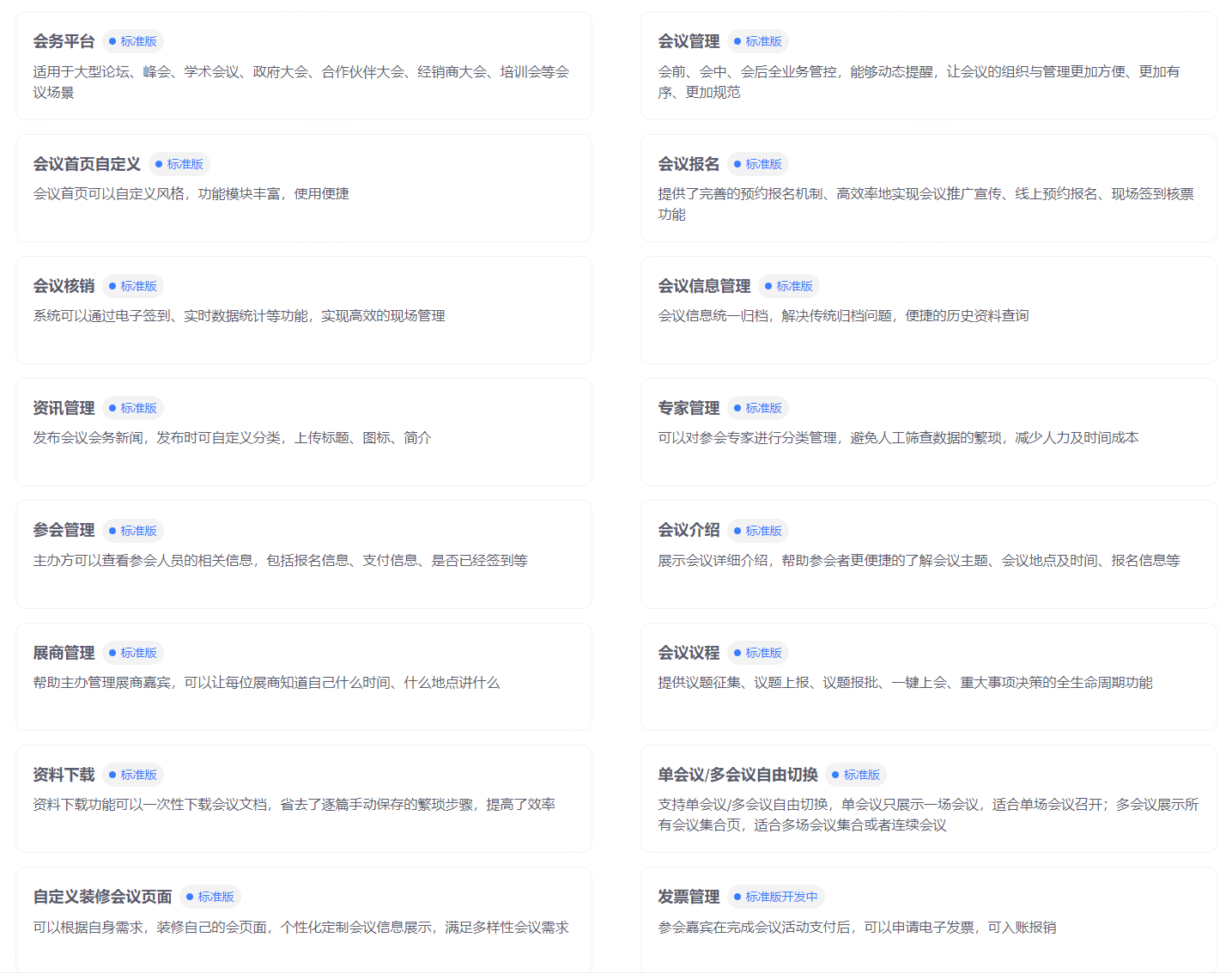 这款就像一个超级管家,它能让您对会议的各个方面进行标准化的管理。无论是大型论坛、学术会议还是政府大会,它都能应对自如。您可以根据自己的需求,自定义会议痴女的风格,添加各种功能模块,让参会者一眼就能爱上您的会议。