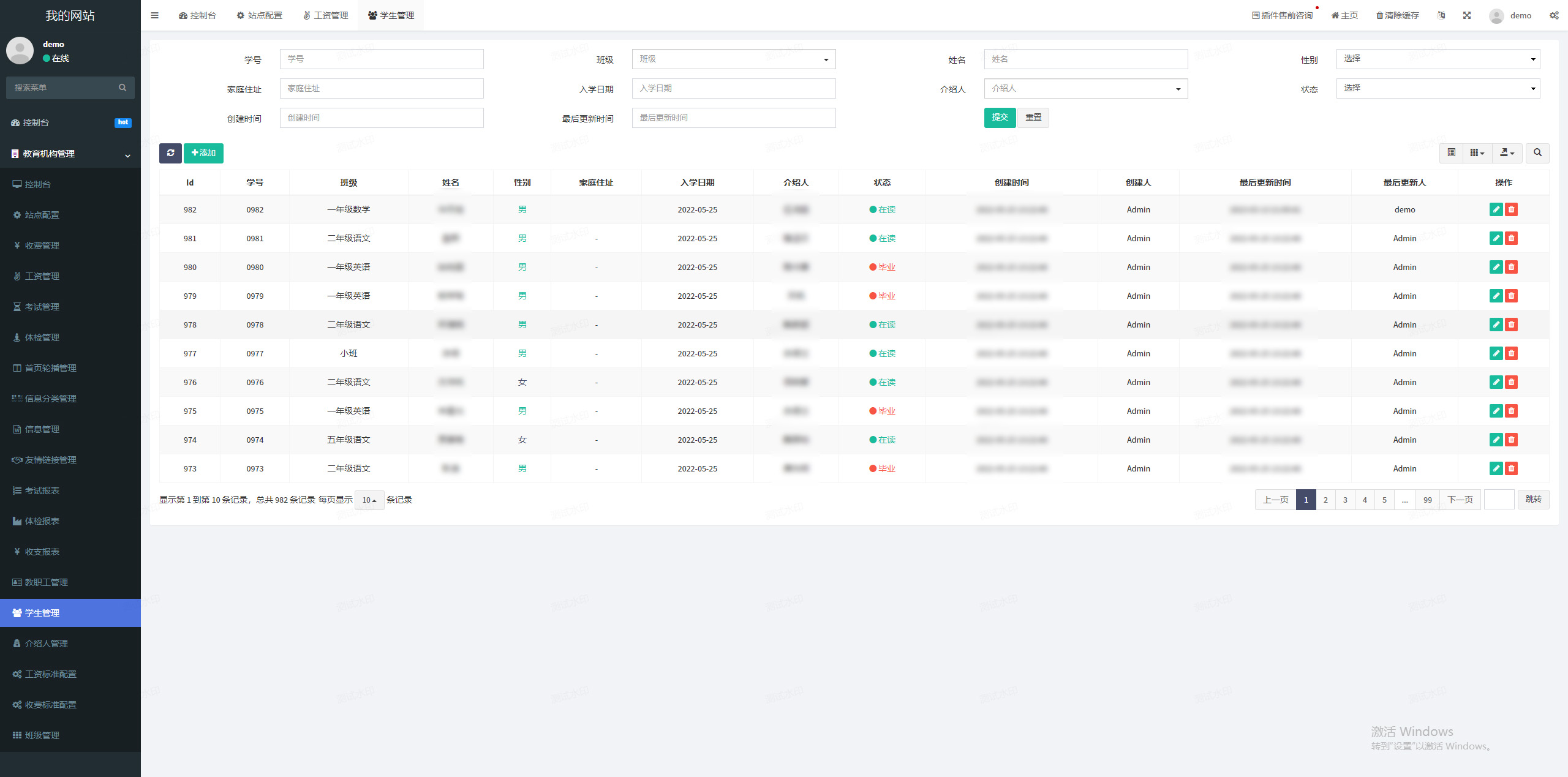 1. 统计控制台:系统提供了一个综合的统计控制台,可以实时查看学校的通用数据,包括分班级学生性别统计和占比,以及教职工和介绍人的数量。这为学校管理层提供了一个宏观的视角,帮助他们更好地了解学校的人员构成。