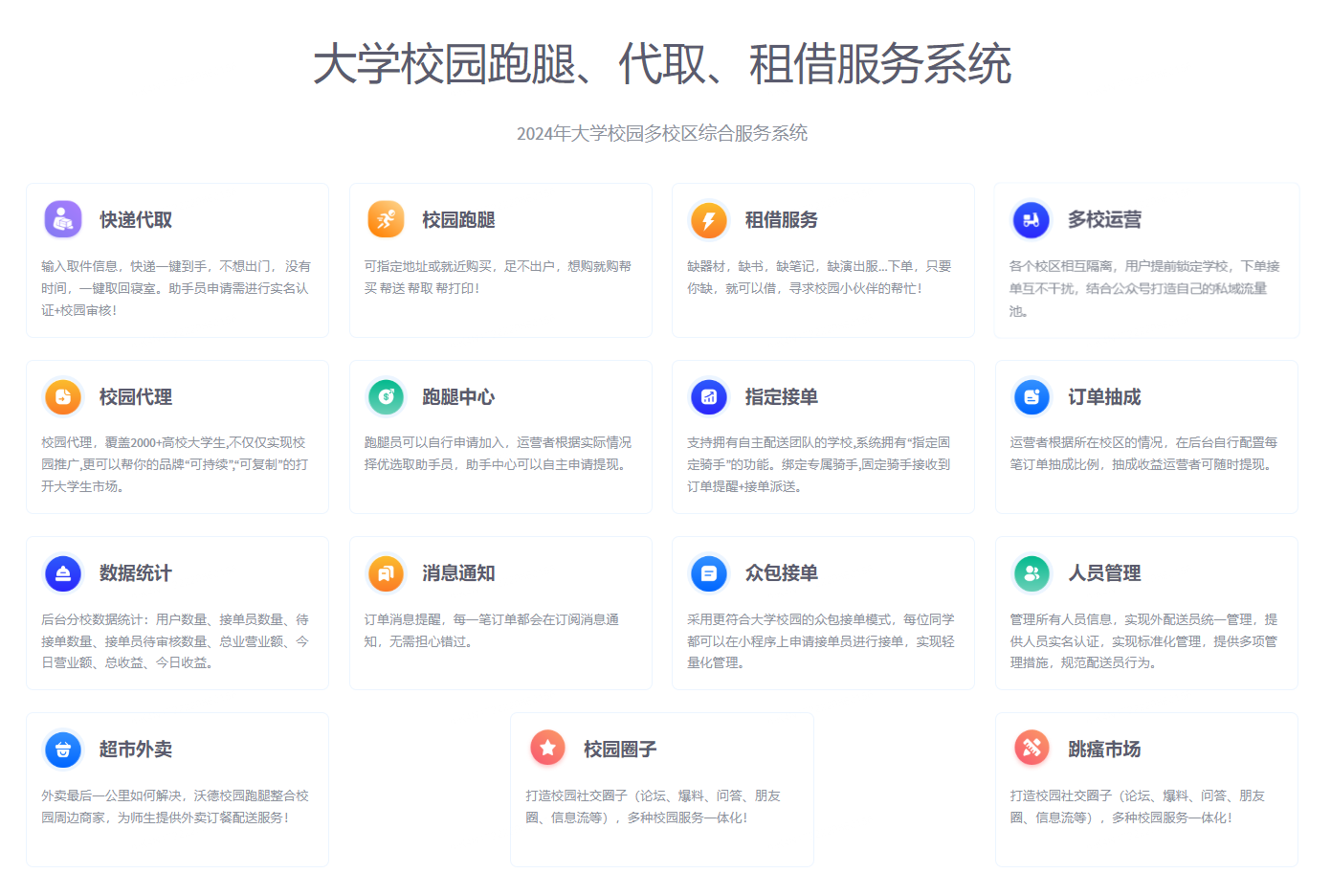 大家好,我是成都痴女 公司的产品经理,今天我很荣幸地向大家介绍我们2024年全新推出的大学校园学生服务系统。这款系统致力于为广大高校学子提供便捷的学习和生活服务,涵盖了校园跑腿、快递代取、租借服务等多个方面,同时支持多校运营模式,各小区之间相互隔离,互不干扰。下面我来介绍我们这套系统的核心功能。