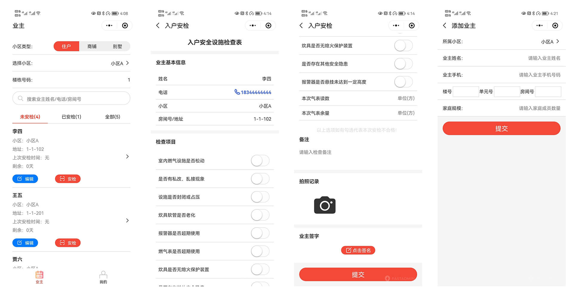在业主管理方面,管理人员可以通过后台方便地添加或批量导入业主信息,并能直观地看到每个业主家中设备的安检状态和安检记录。这不仅便于及时跟进安检工作,也使得业主能够清晰地了解自己的安检情况。